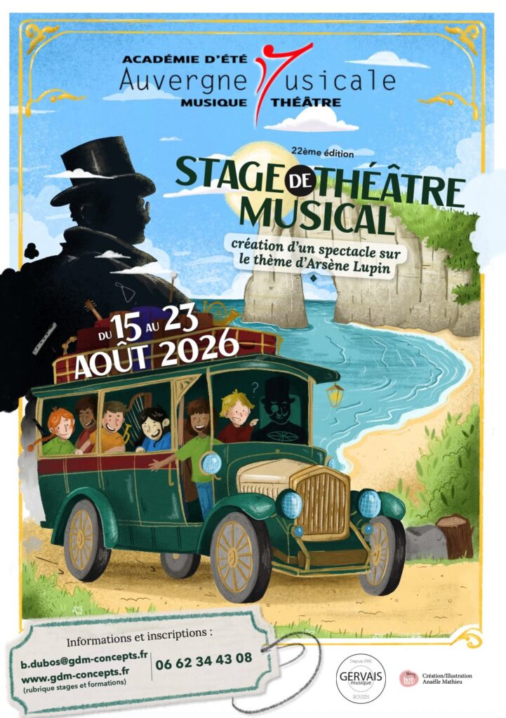 Les inscriptions pour la 22éme édition de l’académie Auvergne Musicale sont ouvertes! Du 16 au 23 août 2026, dans le cadre idyllique du village de Coltines, situé à une dizaine de kilomètres de Saint-Flour, de jeunes musicien-nes se retrouvent pour créer un conte musical ayant pour thème « Arsène Lupin ». Hébergés dans un établissement rénové récemment, encadrés par une équipe motivée, accompagnés par des professeurs de talent, ils travailleront à la réalisation d’un projet qui mêle la musique et le théâtre. Et chaque année, la magie se recrée pour donner naissance à un spectacle unique en son genre. Ouvert aux enfants de 10 à 18 ans, d’un niveau fin de premier cycle au minimum, ce stage multi-instrumental est l’occasion de rencontres musicales et amicales de qualité dans un environnement préservé.